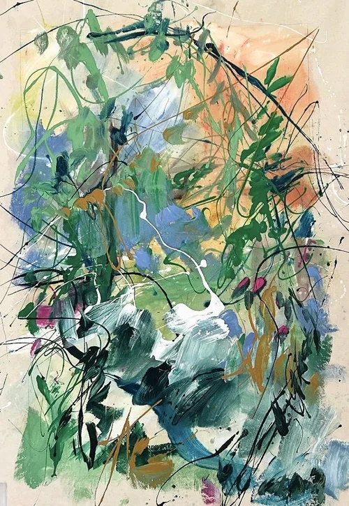 Acrylic, latex, ink and spray paint on canvas. Framed