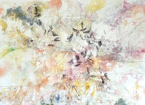 Acrylic, ink, gold leaf, pastel and spray on linen